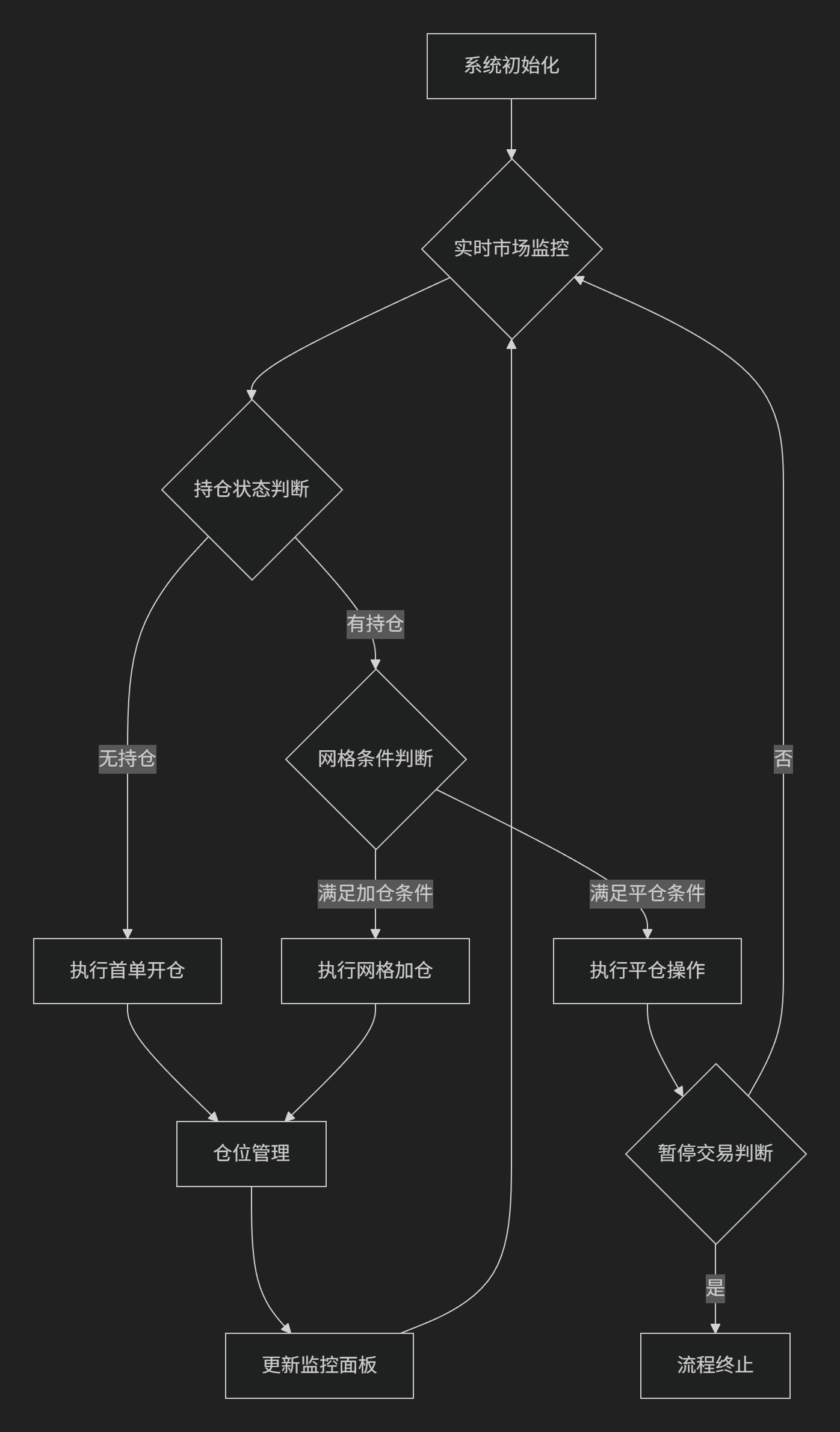 系统以 基础手数开始首笔交易。当价格逆持仓方向波动达到 加仓间距(以点为单位)时,会以新的手数进行加仓。手数增长模式由 使用固定手数和 手数倍率共同决定:若使用固定手数,则每次加仓手数不变;反之,则根据 手数计算模式(如马丁格尔模式)按倍数增加,旨在摊平成本并在市场回调时快速盈利。最多持仓数量参数严格限制了网格的最大层级,防止无限加仓。