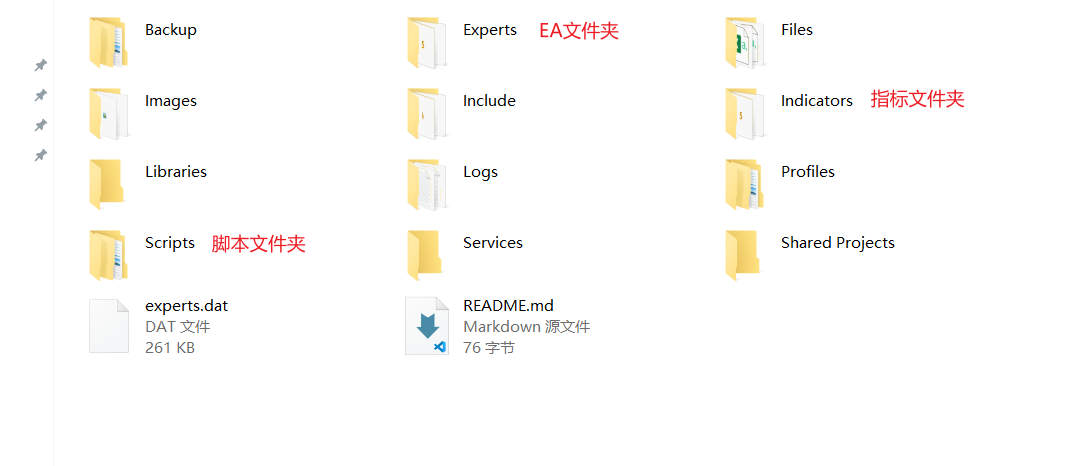 打开数据文件夹后,您会看到多个子文件夹。请将下载好的文件(通常是.ex4、.ex5或.mq4、.mq5文件)复制到对应的文件夹中: