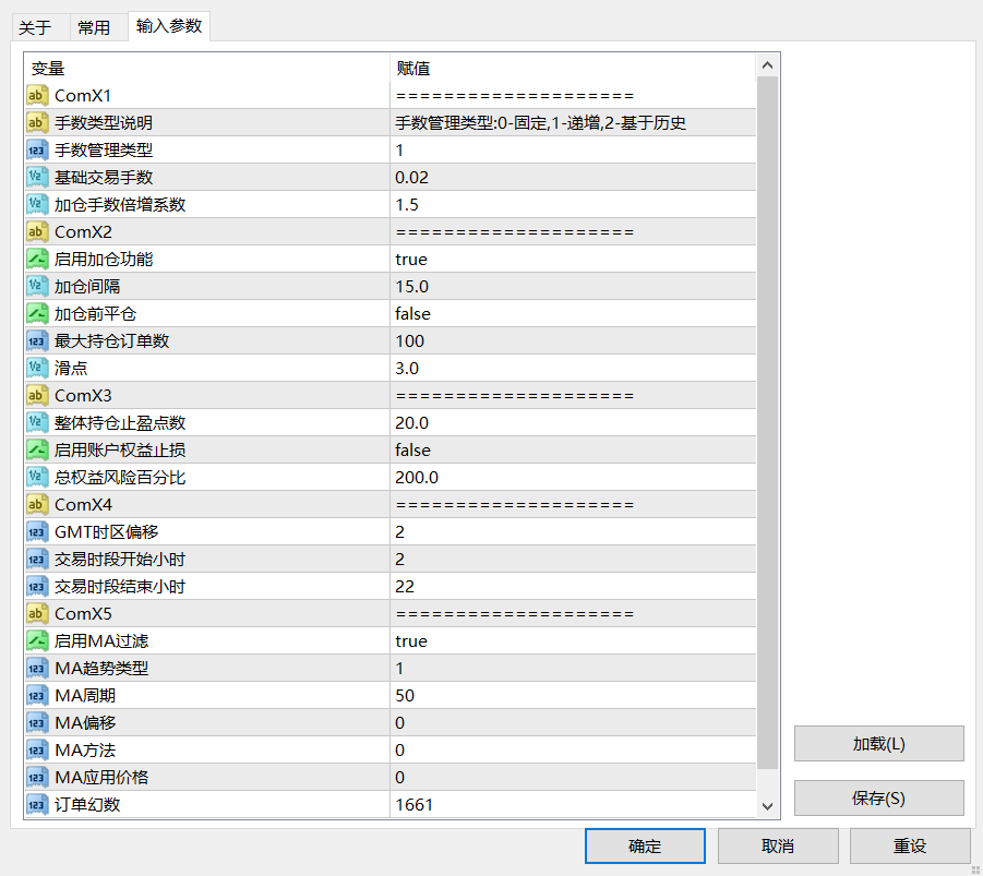 网格加仓参数定义了交易执行逻辑,加仓间隔点数(默认15点)控制加仓阈值,加仓倍率系数(默认1.5)确定手数增长幅度,最大持仓订单数(默认100)限制网格深度.
